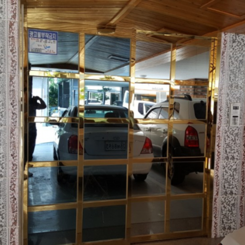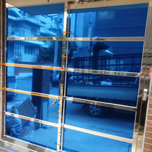 이문동 빌라 자동문 시공 - 블루은반사 격자 프레임도어 자동문 설치 -